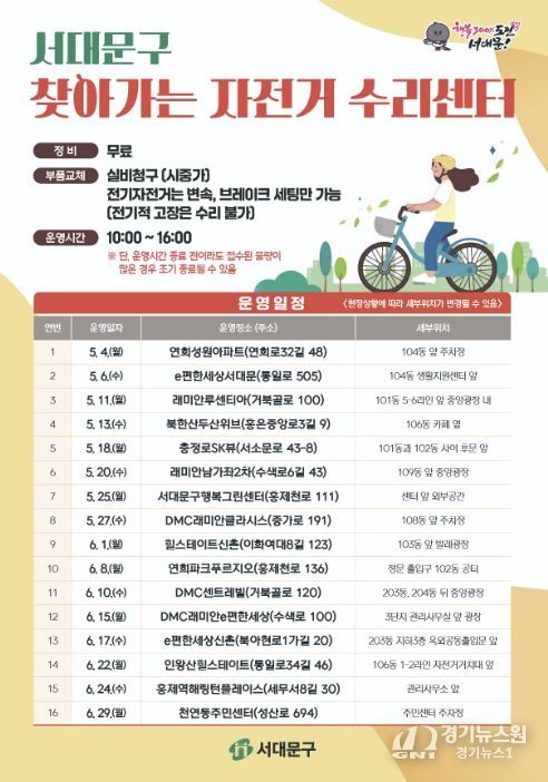 [경기뉴스원/경기뉴스1] | 서대문구가 주민들의 자전거 이용 활성화와 안전한 운행을 위해 5∼6월과 9∼11월 ‘찾아가는 자전거 수리센터’를 총 32회 운영한다.