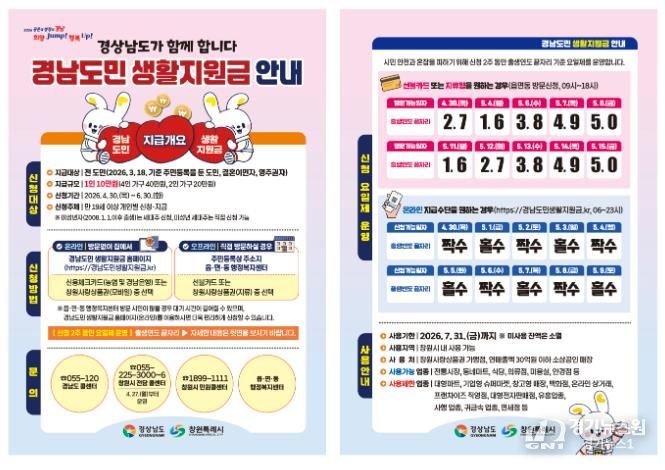 [경기뉴스원/경기뉴스1] | 창원특례시는 고유가·고물가 등으로 가중된 민생 부담을 완화하기 위해 시행되는 ‘경남도민 생활지원금’ 지급을 오는 4월 30일부터 본격적으로 시작한다고 밝혔다.