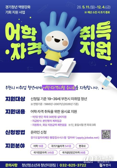 박정옥 부천시 청년청소년과장은 “이번 사업이 취업을 준비하는 청년들의 경제적 부담을 덜고 실질적인 역량 강화로 이어지길 바란다”며 “앞으로도 청년이 체감할 수 있는 맞춤형 지원 정책을 지속 추진하겠다”고 말했다.