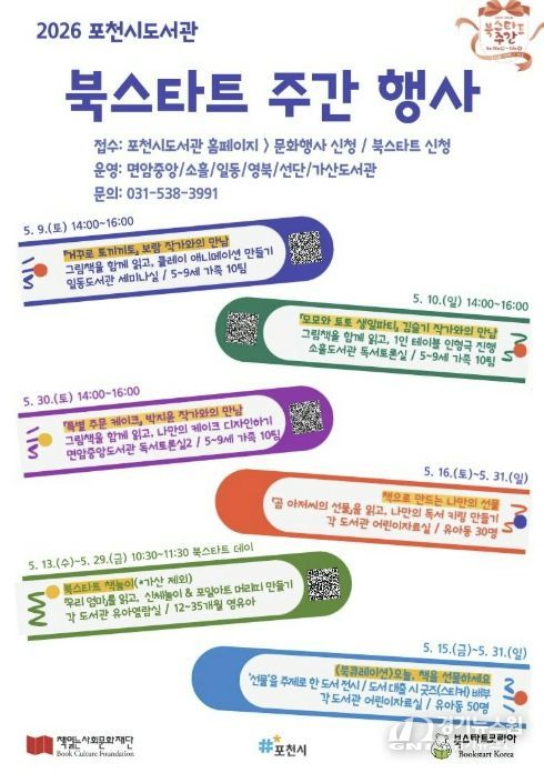 [경기뉴스원/경기뉴스1] | 포천시도서관은 북스타트코리아와 책읽는사회문화재단이 주최하는 ‘2026 북스타트 주간 지원사업’에 선정됨에 따라, 5월 9일부터 면암중앙·소흘·일동·영북·선단·가산도서관 등 6개소에서 북스타트 주간 행사를 운영한다.