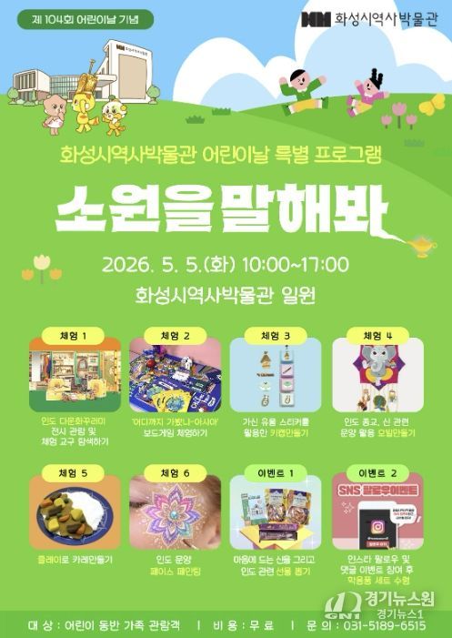 [경기뉴스원/경기뉴스1] | 화성시 역사박물관은 어린이날을 맞아 오는 5월 5일 오전 10시부터 오후 5시까지 박물관 일원에서 어린이날 특별 프로그램 ‘소원을 말해봐!’를 운영한다.