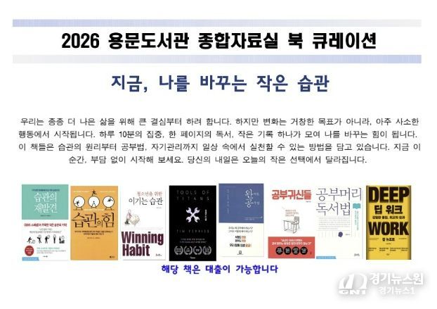 [경기뉴스원/경기뉴스1] | 양평군은 5월 2일부터 6월 30일까지 용문도서관 종합자료실에서 ‘지금, 나를 바꾸는 작은 습관’을 주제로 도서 추천 서비스(북 큐레이션)를 운영한다고 밝혔다.