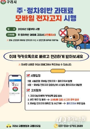 [경기뉴스원/경기뉴스1] | 구리시는 5월부터 주·정차 위반 과태료 고지서를 카카오톡 전자문서로 발송하는 ‘모바일 전자고지 서비스’를 시행한다고 밝혔다.