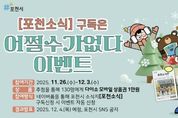 [경기뉴스원/경기뉴스1] | 포천시는 시민과의 소통을 강화하기 위해 오는 12월 3일까지 시정 소식지 ‘포천소식’ 구독 이벤트를 진행한다. 이번 이벤트는 12월 3일까지 진행되며, 시정 소식지 ‘포천소식’을 구독하면 별도의 절차 없이 자동으로 이벤트에 응모된다. ‘포천소식’은 총 24면으로 구성된 월간지로, △기획 △시정소식 △문화 △일자리 △생활정보 등 포천의 주요 현안과 시민들에게 유용한 생활 밀착형 정보를 종합적으로 제공하고 있다. 이벤트 참여 방법은 포천시청 공식 누리소통망(SNS)에 게시된 이벤트 글에 ‘좋아요’와 댓글을 남기고, 네이버폼을 통해 소식지 구독을 신청하면 된다. 시는 참여자 중 추첨을 통해 총 130명에게 다이소 모바일상품권 1만 원을 제공할 예정이다. 포천시 관계자는 “이번 이벤트를 통해 다양한 생활정보와 시정 소식을 신속하게 전하는 ‘포천소식’을 더 많은 시민들에게 알릴 수 있기를 기대한다”며 “앞으로도 시민과의 소통을 확대하기 위한 다양한 노력을 지속하겠다”고 말했다.
