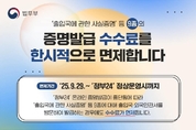 정부24 서비스 중단에 따라, 법무부는 국민 불편을 최소화하기 위해 출입국 관련 9종 증명서에 대해 직접 방문 발급 시 수수료를 한시적으로 면제한다고 밝혔다. 이번 조치는 지난 9월 28일 발생한 국가정보자원관리원 화재로 인해 정부24를 통한 온라인 증명서 발급이 중단된 데 따른 후속 대응이다. 그동안 온라인으로 발급 가능했던 증명서가 일시적으로 오프라인 방문 발급만 가능해지자, 법무부는 민원인의 경제적 부담과 시간적 불편을 덜기 위한 긴급 조치로 수수료 면제를 결정했다. 수수료 면제 대상 증명서 (총 9종) 출입국에 관한 사실증명 그 외 8종의 출입국 관련 민원서류 (세부 목록은 관할 출입국기관 확인) ️ 면제 기간 2025년 9월 29일 ~ 정부24 정상 운영 시까지 발급 장소 전국 출입국·외국인청, 출장소 등 소속기관 법무부 관계자는 “이번 수수료 면제는 갑작스러운 시스템 장애로 인한 민원인의 불편을 최소화하기 위한 조치”라며, “정부24 복구 전까지는 모든 민원인이 차질 없이 증명서를 발급받을 수 있도록 최선을 다하겠다”고 전했다. 한편, 정부24의 정상화 일정은 아직 확정되지 않았으며, 법무부는 향후 상황에 따라 면제 기간 연장 여부를 검토할 계획이