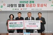 [경기뉴스원/경기뉴스1] | 예천군은 26일 오전, 경북사회복지공동모금회(회장 전우헌)가 주최하는 ‘2025 경상북도 찾아가는 이웃돕기 유공자 포상식’이 예천군청에서 열렸다고 밝혔다. 이번 행사는 희망 2025 나눔캠페인과 나눔 및 선행문화 확산에 기여한 개인 및 나눔봉사단의 공로를 기리고 격려하기 위해 마련됐다. 이날 행사에서 나눔·봉사를 실천한 공로로 사회복지공동모금회장 표창에 학가산 전통메주마을 박상지 대표, 기부와 선행을 실천한 공로로 경북도지사표창에 해인종합상사 황지훈 대표, 최우수 봉사단에 예천군 사랑의열매 나눔봉사단이 선정됐다. 아울러 봉사단 활동에 활발히 참여해 준 김종순 사무국장과 박승용 단원에 사회복지공동모금회장 표창을 수여했다. 예천군 사랑의열매 나눔봉사단은 ‘희망2025나눔캠페인’에서 약 5억 8천만 원의 이웃돕기 성금을 모금했으며, 착한가게 영입, 나눔리더 발굴 등 따뜻한 나눔문화 확산에 앞장선 결과 2년 연속 최우수 봉사단으로 선정될 수 있었다. 경북사회복지공동모금회 손병일 사무처장은 “한해 동안 열심히 활동 해 주신 예천군 사랑의 열매 나눔봉사단에 감사드리며, 내년에도