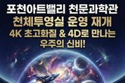 [경기뉴스원/경기뉴스1] | 포천문화관광재단이 운영하는 포천아트밸리 천문과학관이 약 1년간의 준비와 개선 사업을 마치고, 3월 4일부터 새롭게 단장한 천체투영실 운영을 재개한다. 2014년 개관한 포천아트밸리 천문과학관은 연간 약 30만 명의 관람객이 찾는 경기 북부 대표 과학문화시설로 자리 잡아 왔다. 그러나 천체투영실 시설 노후화로 관람객 이용에 불편이 발생함에 따라, 포천문화관광재단은 지난해부터 시설 개선 사업을 추진했다. 이번 개선 사업은 ‘오감을 자극하는 몰입형 우주 체험’을 목표로 진행됐다. 기존 장비를 전면 교체하고 4케이(K) 초고해상도 영상 시스템을 도입해 실제 우주 공간에 있는 듯한 생생한 시각적 경험을 제공하도록 구성했다. 또한 영상 흐름에 따라 좌석이 움직이는 모션 장비를 설치해 4디(D) 체험형 콘텐츠를 구현했다. 신규 영상 콘텐츠 ‘콤콤(미지의 행성을 찾아 떠나는 우주 여행)’을 비롯해 스카이다이빙, 달 탐사 등 다양한 체험형 영상을 순차적으로 상영할 예정이다. 이를 통해 어린이들에게는 우주와 과학에 대한 꿈과 호기심을, 성인 관람객에게는 색다른 과학문화 체험을 제공할 것으로 기대된다.