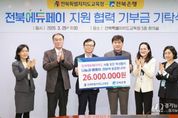 [경기뉴스원/경기뉴스1] | 전북에듀페이카드 운영사인 전북은행이 전북특별자치도교육청에 장학금 2,600만 원을 기부했다. 전북교육청과 전북은행은 25일 본청 5층 회의실에서 전북에듀페이 지원 협력사업 기부금 기탁식을 개최했다. 전북은행은 이날 전북에듀페이카드 바우처 사용액의 0.1%에 해당하는 2,600만 원의 기부금을 학생 복지와 지역사회 공헌의 취지로 기탁했다. 지난해 2,000만 원을 기부한 전북은행은 내년까지 3년 동안 약 6,300만 원을 기부할 계획이다. 전북은행 기부금은 전북특별자치도교육청사랑의장학회를 통해 장학금으로 전달된다. 올해 초중고 학생과 학교 밖 청소년 등 총 16만3,000여 명에게 238억여 원의 전북에듀페이를 지원하기로 한 전북교육청은 이달 24일부터 다음 달 15일까지 집중신청 기간을 운영하고 있다. 김은호 전북은행 부행장은 “전북에듀페이카드 운영사로서 전북에듀페이를 매개로 나눔과 베풂의 학생 교육복지에 동참할 수 있어 뜻깊게 생각한다”고 밝혔다. 한긍수 정책국장은 “전북에듀페이가 단순한 지원금을 넘어 교육과 나눔이 공존하는 선순