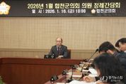 [경기뉴스원/경기뉴스1] | 합천군의회는 지난 16일, 합천군의회 간담회장에서 병오년 새해 첫 번째 합천군의회 의원 정례간담회를 개최했다고 전했다. 군의원 및 국장· 소장 · 담당관과 관계 부서장 등 20여명이 참석한 이 날 간담회에서는 통합돌봄 TF 구성·운영, 2026년 열린 관광지 조성사업 공모사업 선정 등 향후 주요 군정 추진현황에 관한 부서장의 보고와 함께 제296회 합천군의회 임시회 운영과 2025 회계연도 세입세출결산 검사위원 선임을 위한 협의 등을 논의했다고 관계자는 밝혔다. 이날 정례간담회에서 정봉훈 의장은 “전 의원과 공직자께서는 병오년 새해, 군민을 위한 의정과 군정 실현을 위해 ‘2026년도 군민과의 대화’의 업무추진에 만전을 기하여, 군민이 더욱 살기 좋은 합천군으로 이끌어 주실 것을 당부한다.”고 전했다. 한편 합천군의회는 2025회계연도 세입세출예산 결산검사위원의 선임과 각종 조례안 동의안 등의 심의 · 의결 등을 위하여 오는 2월 5일부터 2월 10일까지 6일간의 일정으로 제296회 합천군의회 임시회를 개회할 예정이다.