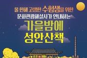 [경기뉴스원/경기뉴스1] | 청주시는 2026학년도 대학수학능력시험을 치른 수험생을 대상으로 ‘가을밤에 성안산책’ 프로그램에서 특별 이벤트를 진행한다고 12일 밝혔다. 11월 성안산책 프로그램에 참여한 수험생에게 성안길상점가에서 사용할 수 있는 상품권(5천원)을 제공하는 내용으로, 2026학년도 수능 수험표를 소지한 수험생에게 적용된다. 가을밤에 성안산책은 9~11월 매주 금요일과 토요일 오후 7시부터 8시까지 한 시간 동안 청주 원도심 문화유산 5곳을 돌며 청주시 문화관광해설사의 해설을 듣는 프로그램이다. 참가 신청은 청주여기 모바일 앱을 통해 가능하며, 사전 신청한 선착순 40명에 한해 상품권이 지급될 예정이다. 한편, 가을밤에 성안산책은 오후 7시 이후 유동 인구가 급감하는 성안길과 중앙공원 일대를 활성화하기 위해 기획됐다. 지난 10일 기준 누적 참여인원은 558명을 기록, 원도심을 대표하는 신규 야간관광 체험 콘텐츠로 자리매김하고 있다. 이현숙 관광과장은 “시험을 마친 수험생들이 가을밤 정취를 마음 편히 즐기고, 올 한해 지친 마음을 치유할 수 있는 알찬 시간이 되길 바란다”며