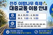 [경기뉴스원/경기뉴스1] | 주말을 맞아 이팝나무가 만개한 전주시 팔복동 철길을 찾는 시민들을 위해 전주시내버스가 더 자주 다닌다. 전주시는 오는 25일~26일, 5월 1일~3일 등 총 5일간 팔복예술공장 일대에서 펼쳐지는 ‘2026 전주 이팝나무 축제’에 맞춰 방문객 집중 시기에 시내버스 운행을 조정하는 등 교통수요 중심의 운영 대책을 추진한다고 23일 밝혔다. 시는 올해 4월 벚꽃 개화 시기에 맞춰 만경강변 일대에 특별노선을 운영하는 등 계절별 관광수요에 대응한 교통 지원을 추진했으며, 이러한 운영 경험을 바탕으로 이번 이팝나무 축제 기간에도 교통 운영을 이어갈 계획이다. 이번 축제는 개화 시기에 맞춰 연속 운영이 아닌 주말·공휴일에 집중 운영 방식으로 진행되는 것이 특징으로, 시는 방문객이 몰리는 시기 주말·공휴일 버스 운행을 조정해 5개 노선에 버스 7대를 추가 하는 등 교통 지원을 강화키로 했다. 축제장을 경유하는 전주시내버스 노선은 △101번 △103-1번 △103-2번 △337번 △383번 △385번 △401번 △402번 △403번 △420번 △644번 △684번 △1001번 △100