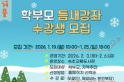 [경기뉴스원/경기뉴스1] | 속초교육문화관은 3월 정규 강좌 개강에 앞서 학습 공백기를 활용한 학습 기회를 제공하고자, 2월 3일부터 6일까지 학부모와 지역주민을 대상으로 ‘겨울 학부모 틈새강좌’를 운영한다. 이번 틈새강좌는 △달콤한 저장법 수제 청 만들기 △자연 성분 그대로 천연비누 만들기 △실속있게 배우는 선물 · 보자기 포장법 △손맛 담은 떡 공방 △나를 가꾸는 메이크업 기초로 총 5강좌이다. 각 강좌는 3회차로 운영되며, 강좌별 모집인원은 10명이다. 수강 신청은 1월 19일 오전 10시부터 25일 오후 6시까지 속초교육문화관 누리집에서 선착순으로 신청할 수 있다. 이윤전 속초교육문화관장은 “틈새강좌가 실생활에 바로 활용할 수 있는 배움의 기회를 제공해 학습 공백기를 효과적으로 채우는 계기가 되길 바라며, 많은 학부모와 지역주민의 관심과 참여를 바란다.”라고 말했다. 기타 자세한 내용은 속초교육문화관 누리집 공지사항을 참고하거나 문헌정보과로 문의하면 된다.