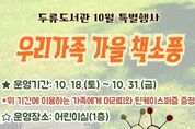 [경기뉴스원/경기뉴스1] | 대구두류도서관은 10월 18일부터 31일까지 어린이실에서 선착순 40가족을 대상으로 책과 소풍 물품을 함께 대여하면 머리띠와 퍼즐을 증정하는‘우리가족 가을 책소풍’행사를 실시한다. 참여를 원하는 가족은 어린이실에 방문하여 도서관 회원증을 제시하고 책과 돗자리, 간이의자, 미니테이블, 독후활동지, 보드게임 등 소풍에 필요한 물품을 대여하고 당일 오후 5시까지 반납하면 된다. 기타 자세한 내용은 도서관 누리집 또는 어린이실로 문의하면 된다.