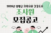 [경기뉴스원/경기뉴스1] | 양평군은 질병관리청 및 양평군보건소와 공동으로 추진하는 ‘2026년 지역사회 건강조사’에 참여할 조사원 6명을 모집한다고 밝혔다. 지역사회 건강조사는 지역 주민의 건강 수준과 생활 습관, 만성질환 현황 등을 파악해 지역 특성에 맞는 보건 정책 수립의 기초 자료로 활용하기 위해 매년 실시되는 국가승인통계다. 이번 조사는 5월 16일부터 7월 31일까지 약 2개월 반 동안 진행되며, 조사 진행 상황에 따라 종료일은 변경될 수 있다. 모집 분야는 ‘2026년 지역사회 건강조사 조사원’으로, 근무 지역은 양평군 관내이며 모집 인원은 총 6명이다. 선발된 조사원은 조사 수행에 앞서 표본지점 확인을 위한 사전 조사를 실시하고, 조사 대상 가구로 선정된 표본가구를 직접 방문해 19세 이상 성인을 대상으로 스마트 기기(태블릿 PC)를 활용한 1대1 면접 조사를 수행하게 된다. 전형은 1차 서류 전형과 2차 면접 전형으로 진행된다. 군은 서류 전형에서 응시자의 자격 및 경력의 적합 여부를 심사하며, 1차 합격자를 대상으로 면접 전형을 실시한다. 원서 접수 기간은 3월 5일부터 13일까지
