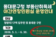 [경기뉴스원/경기뉴스1] | 서울 동대문구가 청량리7구역(롯데캐슬 하이루체) 입주 시기에 맞춰 '취득세 야간 연장 민원실'을 운영한다고 밝혔다. 야간 연장 민원실은 주간에 생업 등으로 구청 방문이 어려운 직장인 등 구민들의 세무 행정 편의를 위한 맞춤형 서비스다. 보금자리 마련과 이사 준비로 바쁜 입주민들이 기한 내 취득세 신고를 마쳐 가산세 등의 불이익을 받지 않도록 하는 데 중점을 뒀다. 야간 연장 민원실은 오는 5월 1일부터 6월 30일까지 두 달간 매주 화요일 오후 6시부터 8시까지 동대문구청 2층 세정과 민원창구에서 한시적으로 운영한다. 구민들은 부동산 취득세 신고는 물론, 개별 상황에 맞춘 세무 상담도 받을 수 있다. 김기현 부구청장은 “주간 방문이 어려웠던 구민들이 여유롭고 편안하게 야간 창구를 이용하시길 바란다”라며 “대규모 입주에 따른 불편을 최소화하고, 선제적인 세무 행정 서비스를 제공해 신뢰받는 동대문구를 만들어가겠다”라고 말했다.