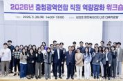 [경기뉴스원/경기뉴스1] | 충청광역연합이 4개 시·도(대전·세종·충북·충남) 파견 직원들의 정책 이해도를 높이고 조직 결속력을 다지기 위한 본격적인 역량 강화 행보에 나섰다. 충청광역연합은 3월 26일 보람동 행복누림터에서 전 직원을 대상으로 ‘2026년 충청광역연합 직원 역량강화 워크숍’을 개최했다고 밝혔다. 이번 워크숍은 연합 직원들이 연합의 설립 취지와 주요 정책을 빠르게 숙지하고 향후 충청권 행정환경 변화에 능동적으로 대응할 수 있도록 마련됐다. 이날 워크숍에서는 최민호 충청광역연합장이 직접 강사로 나서 ‘행정환경에 따른 연합의 역할’을 주제로 특강을 진행했다. 최 연합장은 특강을 통해 초광역 협력체의 필요성을 강조하며, 충청권의 공동 번영을 위한 직원들의 사명감과 역할을 당부했다. 특히, 현대의 시대정신이 ‘에너지 확보, 기술 인력 양성, 기업 우호적 환경 조성, 물관리’임을 강조하며, 시대정신을 반영한 정책을 구상하고 추진하는 것이 공직자에게 필요한 자세라고 힘주어 말했다. 이어지는 강의에서는 대전연구원 염인섭 책임연구위원이 ‘연합의 출범 배경 및 역사, 주요
