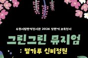 [경기뉴스원/경기뉴스1] | 경기도 수원시립미술관은 자연과의 관계를 성찰하고 생태적 가치를 체험하는 참여형 교육전시 《그린그린 뮤지엄 : 별가루 신비정원》을 3월 24일부터 7월 24일까지 수원시립만석전시관에서 개최한다. 《그린그린 뮤지엄》은‘자연과의 눈맞춤’을 주제로 자연의 초록(Green) 빛을 예술로 그려낸다(Drawing)는 중의적 의미를 담아 연간으로 운영된다. 2026년 상ㆍ하반기 두 차례에 걸쳐 운영되며, 상반기 1부 전시는《그린그린 뮤지엄: 별가루 신비정원》에 이어 하반기에는 새로운 주제의 2부 전시가 이어질 예정이다. 이번 전시는 회화 작가 진영(b.1982)과 설치, 사운드 등 융복합 작업을 선보이는 팀 아르테코(est.2023, 설혜린, 이소희, 김창수, 드림스케이프)가 참여한다. 전시는 총 20점의 작품으로 구성되며, 두 개의 섹션을 통해 자연을 감각하고 사유하는 경험을 제공한다. 첫 번째 섹션 '어두운 밤, 숲의 이야기'는 앵무새를 매개로 숲의 서사를 그려내는 작가 진영의 작품을 소개한다. 클로드 모네의 '수련이 있는 연'을 오마주한 작업 '사이 02'(2024)는 도시 속 유일한 쉼의