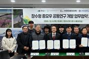 [경기뉴스원/경기뉴스1] | 장수군은 장수한우지방공사, 이티바이오텍(주), 전북대학교와 장수군청 회의실에서 장수한우 품질 고급화를 위한 ‘장수형 저탄소 종모우 개발’ 공동연구 상호협력 업무협약(MOU)을 체결했다고 11일 밝혔다. 이번 협약은 협약기관 간 상호 업무협조 체계를 구축해 장수 한우 산업의 경쟁력을 높이기 위한 장수 지역 사양환경에 적합한 우수 유전자원을 확보하고, 탄소배출을 줄이면서도 생산성과 품질을 높일 수 있는 종모우 개발을 위해 마련됐다. 특히 종모우 개발을 통해 장수 한우 고유의 유전형질을 확립하고 탄소배출 저감과 생산성 향상을 동시에 달성하는 것이 핵심 목표다. 협약에 따라 군은 저탄소 종모우 개발을 위한 사업 총괄 및 행·재정적 지원을 하고 장수한우지방공사는 채정·가공·사양관리와 농가 컨설팅에 나선다. 또한 이티바이오텍은 유전체 기반 연구개발을 진행하고 전북대학교는 유전 능력 평가와 우량 암소·후보 종모우 선발을 각각 담당한다. 장수군은 이번 공동연구를 최근 지정된 전북특별자치도 농생명산업지구 내 ‘저탄소한우 산업지구’ 조성사업과 연계해 2030년까지 단계적으로