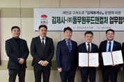 [경기뉴스원/경기뉴스1] | 김제시는 27일 ㈜풀무원푸드앤컬처와 '새만금전주간' 고속도로 개통에 따라 새롭게 조성되는‘김제휴게소’운영에 따른 업무협약을 체결했다고 밝혔다. 이날 시청에서 열린 협약식에는 정성주 김제시장과 이동훈 ㈜풀무원푸드앤컬처 대표가 참석해 오늘 11월 21일부터 운영 예정인 김제휴게소를 통한 다각적 협력 방안을 추진하기로 뜻을 모았다. 이번 협약은 ▲일자리 창출 및 지역민 최우선 고용, ▲김제휴게소 운영과 활성화를 위한 신속·원활한 행정지원 협력, ▲상호 다각적인 지원방안 모색 등 지역과 기업의 상생을 위해 함께 노력하기로 했다. ‘김제휴게소’는 '새만금-전주간 고속도로' 새만금과 전주방향에 각 1개소씩 총 2개소가 개장할 예정으로 ㈜풀무원푸드앤컬처가 운영사로 선정됐으며, 각 휴게소는 식당, 즉석매장, 편의점, 카페 등 다양한 편의시설과 주유소가 조성됐다. 특히 새만금방향 휴게소에는 2층에 백산저수지를 한눈에 볼 수 있도록 복합 문화형 휴게공간을 마련하여 운전자들에게 휴식과 힐링을 제공할 예정이다. ㈜풀무원푸드앤컬처 이동훈 대표는 “이번 협약을 통해 김제시와 지속적인 협력체계를