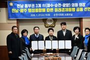 [경기뉴스원/경기뉴스1] | 여수시의회는 27일 오후 3시 순천시의회 의장실에서 강형구 순천시의회 의장, 최대원 광양시의회 의장과 함께 '전남·광주 행정통합에 따른 전남동부권(여수·순천·광양) 미래경제동맹 공동선언문'을 발표했다. 이번 공동선언은 전라남도와 광주광역시의 행정통합 논의가 진행되는 가운데, 전남동부권이 국가 산업·에너지·물류 거점으로서 수행해 온 역할과 향후 기능이 통합 과정에서 반드시 반영돼야 한다는 데 3개 시의회 의장이 뜻을 모으며 마련됐다. 3개 시의회 의장은 공동선언을 통해 전남·광주 행정통합이 수도권 일극체제 완화와 국가균형발전을 위한 계기가 돼야 하며, 단순한 행정구역 개편을 넘어 산업·교통·에너지·물류·인재 정책을 연계하는 초광역 경제권 형성으로 이어져야 한다는 점을 강조했다. 아울러 행정통합 이후 정책과 재정, 대규모 국책사업이 광주권과 전남 서부권에 집중될 가능성에 대해 우려를 표하며, 전남동부권의 산업적 위상과 기능이 통합 논의 전반에 균형 있게 반영돼야 한다는 입장을 분명히 했다. 여수·순천·광양 3개 시의회 의장은 공동선언을 통해 ▲전남동부권의 국가산업 거점 기능