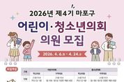 [경기뉴스원/경기뉴스1] | 마포구는 4월 6일부터 24일까지 ‘제4기 어린이·청소년의회’ 위원을 모집한다. 어린이·청소년의회는 어린이와 청소년이 지역사회 구성원으로서 지역 현안을 논의하고 정책을 제안하는 참여기구다. 의원으로 선발되면 위촉장과 의원 배지를 수여하고 상임위원회 회의와 본회의 등 모의 의정활동에 참여하며 지방의회의 역할과 기능을 체험한다. 이 과정에서 정책과 사업, 입법 제안 등 다양한 의정 과정을 경험하고, 발굴한 정책을 실제 구정에 반영할 기회도 주어진다. 또한 의회 견학과 리더십·자질 함양을 위한 소양교육 등을 통해 민주시민으로서의 역량을 기를 수 있다. 모집 대상은 마포구에 거주하거나 지역 내 학교에 재학 중인 18세 미만 아동으로, 어린이의회(13세 미만)와 청소년의회(13세 이상 18세 미만)로 나눠 각각 50명씩 총 100명 이내를 선발할 예정이다. 모집은 학교 추천과 기관 추천, 개인 신청으로 진행되며, 마포구청 누리집 공지사항에 게재된 신청서를 작성해 담당자 전자우편 또는 마포구청 가족정책과에 제출하면 된다. 선발된 위원은 오는 5