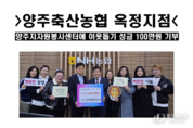 경기뉴스원(경기뉴스1) | 양주축산농협 옥정지점(지점장 이회진)은 23일, 양주시자원봉사센터에 이웃돕기 성금 100만원을 기탁했다. 이날 이회진 지점장이 양주시상인회협동조합의 회원으로 활동하며, 지역사회의 어려운 이웃을 돕기 위해 이루어졌다. 기탁식에는 양주시상인회협동조합 윤성희 이사장 등 임원들이 참석했다. 이회진 지점장은 “지역사회 일원으로 나눔에 동참할 수 있어 기쁘다”며, 향후에도 지역 주민을 위한 지원을 계속하겠다고 밝혔다. 이정주 자원봉사센터장은 기탁금의 가치를 확산시키기 위해 양주축산농협과 양주시상인회와 함께 다양한 복지 활동을 지속할 것이라고 전했다.