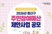 [경기뉴스원/경기뉴스1] | 서울 용산구가 4월 24일까지 2027년 예산에 반영할 주민참여예산 사업을 공모한다. 생활안전, 문화, 복지 등 주민 생활과 밀접한 분야를 대상으로, 총규모는 10억 원이다. 일반사업은 사업당 2억 원 이내, 행사성 사업은 1500만원 이내로 제안할 수 있다. 단, 이미 시행 중인 사업이나 법령‧조례상 부적합한 사업, 구 소관사무가 아닌 사업, 특정 민간단체지원을 목적으로 하는 사업 등은 선정 대상에서 제외한다. 사업 제안은 용산구민과 용산구에 소재지를 둔 사업체 임직원이나 학생이라면 모두 가능하다. 신청은 기간 내 ▲구 누리집 ‘참여소통-주민참여예산제-용산구 예산 이렇게 사용해주세요!’ 게시판 ▲방문(용산구청 기획예산담당관 및 각 동주민센터) ▲우편(녹사평대로 150, 8층 기획예산담당관) ▲전자우편 중 편한 방법으로 제출하면 된다. 제안 양식은 구 누리집 ‘주민참여예산 게시판’에서 내려받을 수 있다. 접수한 제안 사업은 ▲동 지역 회의 ▲소관부서 검토 ▲주민참여예산위원회 심사 절차를 거쳐 최종 선정한다. 이후 구의회 심의를 통해 2027년 예산으로 확정할 예정이다. 주민참여예산