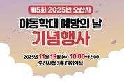 [경기뉴스원/경기뉴스1] | 오산시는 오는 19일 ‘아동학대예방의 날’과 ‘아동학대예방주간’을 맞아 기념행사 및 온·오프라인 캠페인을 실시한다고 12일 밝혔다. 행사는 19일 오전 10시부터 12시까지 오산시청 대회의실에서 진행되며, ▲1부 아동학대예방의 날 기념식 식전공연, 유공자 표창 시상, 퍼포먼스, ▲2부 부모교육 특별강연으로 구성된다. 특별강연은 리플러스 인간연구소 박재연 소장이 ‘부모를 위한 건강한 대화방법’을 주제로 진행한다. 매년 11월 19일은 아동학대 예방과 방지에 대한 사회적 관심을 높이기 위해 제정된 법정기념일로, 오산시는 매년 기념식과 강연, 캠페인 등을 통해 아동학대 예방의 중요성을 알리는 다양한 활동을 추진해오고 있다. 시는 이달 25일까지 온라인 릴레이 캠페인도 함께 진행한다. 오산시민 누구나 SNS에 아동학대예방 메시지 또는 관련 사진을 업로드해 참여할 수 있다. 또한 11월 24일에는 시청 인근 주요 교차로에서 시민 대상 오프라인 홍보 캠페인을 실시해 아동학대 예방 인식 제고에 나설 예정이다. 박현주 아동복지과장은 “이번 행사가 아동학대 예방의 중요성을 되새기고 아이