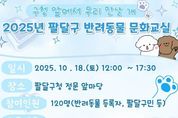 [경기뉴스원/경기뉴스1] | 수원시 팔달구는 10월 18일 오후 12시부터 17시 30분까지 팔달구청 정문 앞마당에서 ‘2025년 팔달구 반려동물 문화교실’을 개최한다고 밝혔다. 반려동물 문화교실은 성숙한 반려문화 확산과 올바른 반려동물 관리, 양육 방법을 알리기 위해 마련됐으며 반려동물 등록자 및 팔달구민 120명을 대상으로 추진한다. 교육 프로그램은 △인식표 만들기 △산책 그룹 훈련 △반려견 셀프 미용으로 총 3개 프로그램을 추진한다. 12시부터 진행하는 ‘인식표 만들기’는 반려견 유실 방지를 위해 동물등록번호와 견주 연락처를 새긴 맞춤형 인식표를 직접 제작할 수 있고, 14시부터는 ‘산책 그룹 훈련’에서는 산책줄 핸들링과 돌발 상황 시 대처법 등 및 올바른 산책 방법에 대해 배워볼 수 있다. 15시 30분에는 초보자도 쉽게 실천할 수 있는 ‘반려견 셀프 미용 수업’이 준비되어 있다. 팔달구 관계자는 “2025년 반려동물 문화교실 개최를 통해 구민들이 반려동물을 책임감 있게 관리하고, 올바른 반려 문화가 조성되길 바란다“라고 말했다. 한편, 팔달구는 구 홈페이지, 안내문자 및 QR코