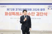 [경기뉴스원/경기뉴스1] | 화성특례시의회는 26일 화성종합경기타운 3층 라운지홀에서 열린 제72회 경기도체육대회 화성시 선수단 결단식에 참석해 선수단을 격려하고 4연패 달성을 위한 결의를 다졌다. 이날 행사에는 배정수 의장을 비롯해 김종복 문화복지위원장, 송선영·이용운 의원, 화성시체육회 임원과 종목단체 관계자, 선수단 등 약 150여 명이 참석했다. 이날 결단식은 경기도체육대회 출전을 앞둔 선수단의 사기를 높이고 각오를 다지는 자리로 마련됐다. 화성특례시 선수단은 오는 4월 16일부터 18일까지 광주시 일원에서 열리는 제72회 경기도체육대회에 출전한다. 육상, 수영, 축구 등 27개 종목에 참가해 종합우승 4연패에 도전한다. 배정수 의장은 “묵묵히 쌓아온 훈련의 시간과 노력을 믿고 끝까지 당당하게 경기에 임해주시기 바란다”며 “선수 여러분의 땀과 투혼이 화성특례시의 자부심”이라고 말했다. 이어 “화성특례시의회도 선수들이 오직 경기에 집중할 수 있도록 체육 환경 조성과 지원에 최선을 다하겠다”며 “4연패 달성을 진심으로 기원한다”고 덧붙였다. 화성특례시의회는 선수들이 충분