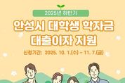 [경기뉴스원/경기뉴스1] | 안성시는 오는 10월 1일부터 11월 7일까지 ‘2025년도 하반기 안성시 대학생 학자금 대출이자’ 지원 신청을 받는다. 지원 대상은 공고일(2025. 10. 1.)기준으로 안성시에 주민등록 주소를 두고 재학(휴학 포함)중인 대학(원) 재학생(휴학생)이다. 지원 대상자로 선정되면 대상자가 한국장학재단에서 대출받은 학자금에 대한 2025년 상반기(1월~6월) 발생 이자를 안성시가 지급하게 된다. 지급은 대출 계좌 원리금에서 차감하는 방식으로 진행되며, 지원 내역은 12월 지급이 확정된 시점에 한국장학재단 인터넷 홈페이지에서 확인할 수 있다. 신청 방법은 주소지 읍·면·동 행정복지센터 또는 안성시청(미래교육과)으로 방문하여 접수하면 된다. 안성시 관계자는 “학자금 대출이자 지원 사업을 통해 대학생들의 학업 부담을 완화하고, 학업에 전념할 수 있는 환경을 조성하는데 도움이 되길 바란다”고 전했다.