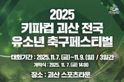 [경기뉴스원/경기뉴스1] | 충북 괴산군은 오는 11월 7일부터 9일까지 3일간 괴산스포츠타운과 청소년수련원 축구장에서 ‘2025 자연울림괴산 전국 유소년축구대회’를 개최한다고 30일 밝혔다. 이번 대회는 (사)한국유소년축구협회와 괴산군체육회가 공동 주최하고, (사)한국유소년축구협회 및 괴산군축구협회가 주관한다. 전국 각지에서 총 70개 팀, 선수 및 임원, 학부모 등 2,000여 명이 참가할 예정이다. 특히 7일 오후 2시에는 괴산스포츠타운 준공식과 함께 개막식이 열리며, 개막 이후 첫 경기로는 괴산군 대표팀인 강호FC가 출전해 대회의 시작을 알린다. 경기는 학년별로 나뉘어 진행된다. 초등 1~3학년부는 6인제, 4~6학년부는 8인제 방식으로 운영되며, 경기의 공정성과 안전성을 확보하기 위해 전문 심판진과 운영 요원이 배치된다. 대회 우승팀에게는 필리핀 뉴클락시티에서 열리는 국제대회 및 동계 해외전지훈련 무상 참가 자격이 주어지며, 이를 통해 선수들이 국제무대 경험을 쌓고 기량을 향상시킬 수 있을 것으로 기대된다. 또한, 이번 대회는 단순한 스포츠 행사를 넘어 지역경제 활
