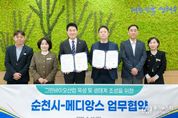 [경기뉴스원/경기뉴스1] | 순천시가 글로벌 토탈 라이프케어 전문기업 ‘메디앙스(주)’와 손잡고 대한민국을 대표하는 그린바이오 산업 생태계 조성에 본격적으로 나선다. 순천시는 10일 순천시청에서 노관규 순천시장과 메디앙스 박수찬 대표이사 등 관계자들이 참석한 가운데 ‘그린바이오 산업 육성 및 생태계 조성을 위한 업무협약’을 체결했다고 밝혔다. 이번 협약은 순천시의 생태․정원 자원과 메디앙스의 고도화된 생산‧연구 역량을 결합해, 지역과 기업이 동반 성장하는 지속가능한 산업 모델 구축을 위해 마련됐다. 보령그룹에서 분리된 메디앙스는 비앤비(B·B), 닥터아토, 유피스 등 천연, 비자극 대표 브랜드를 보유한 기업으로 2025년 무역의 날 ‘수출의 탑’을 수상하는 등 독자적인 글로벌 브랜드로 성장하고 있다. 특히 자연유래성분 제품으로 중국 광군제 유아 세제부문 11년 연속 판매 1위를 기록하는 등 글로벌 시장에서의 수요 폭발로 매출 확대가 이어지고 있다. 이에 급증하는 수출 물량에 대응하고 안정적인 생산 기반 확보를 위해 독보적인 친환경 생태가치와 인프라를 지닌 순천 그린바이오산업 육성지구에