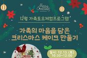 [경기뉴스원/경기뉴스1] | 인천광역시교육청연수도서관은 12월 13일 오전 10시 30분 평생학습1실에서 가족 단위 이용자를 대상으로 ‘12월 가족 토요체험 프로그램’을 운영한다. 이번 프로그램은 6세부터 초등 저학년 자녀와 부모가 함께 크리스마스 케이크를 만드는 체험 강좌로, 크림 데코레이션과 토핑 꾸미기 등 기초 베이킹 활동을 진행한다. 연수도서관은 이번 활동이 아동의 창의력 향상과 가족 간 소통에 도움이 될 것으로 기대한다. 참여 신청은 12월 2일부터 연수도서관 누리집에서 선착순 접수하며, 자세한 내용은 연수도서관 독서문화과로 문의하면 된다.