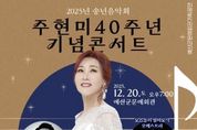 [경기뉴스원/경기뉴스1] | 예산군문예회관은 2025년 송년을 맞아 오는 12월 20일 오후 7시 ‘트롯 여제’ 주현미의 데뷔 40주년을 기념하는 콘서트를 개최한다. 군은 대한민국 대표 트롯 가수인 주현미의 공연을 통해 다사다난했던 한 해를 마무리하고 군민들이 함께 소통하는 자리를 마련했다. 특히 이번 공연은 KBS관현악단 박상현 단장이 이끄는 ‘모스틀리 필하모닉 오케스트라’가 함께해 더욱 웅장하고 감동적인 무대를 선사할 예정이다. 남녀노소 온 가족이 함께 즐길 수 있는 이번 공연의 관람료는 1층 2만원, 2층 1만5000원이며, 예매는 12월 8일 오전 9시부터 인터넷, 전화, 현장 방문을 통해 할 수 있다. 공연과 관련한 자세한 사항은 군청 누리집 또는 전화(041-339-8211∼4)로 확인할 수 있다.