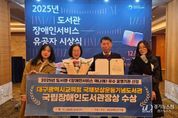 [경기뉴스원/경기뉴스1] | 대구국채보상운동기념도서관이 ‘2025년 도서관 장애인서비스 유공자 시상식’에서 '2025년 도서관 장애인서비스 책나래 우수 운영기관'에 선정되어 ‘국립장애인도서관장’을 수상했다. 올해는 전국 1,183개 도서관을 대상으로 1년 간의 권역별 서비스 실적을 평가해 총 12개 기관이 선정됐다. ‘책나래서비스’는 도서관 방문이 어려운 장애인들의 지식정보 접근 격차 해소를 위해 도서관과 문화체육관광부가 연계하여 2011년부터 추진하고 있는 사업으로, 대출도서를 신청인의 자택까지 무료로 배달하여 많은 호응을 얻고 있다. 책나래서비스 이용을 원하는 희망자는 이용도서관 또는 책나래 누리집에서 회원가입 후 자료를 신청하면 1인당 10권의 도서를 30일 간 무료로 이용할 수 있다. 김동찬 관장은 “이번 수상을 계기로 도서관을 이용하기 힘든 정보소외계층의 도서관 이용 편의 증대와 지식정보 격차 해소를 위해 더욱 힘쓰겠다.”고 전했다.