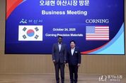 [경기뉴스원/경기뉴스1] | 아산시는 24일 글로벌 첨단 유리소재 선도기업인 코닝정밀소재㈜를 방문해 임직원들과 간담회를 갖고 지역경제 활성화와 상생협력 방안을 논의했다고 밝혔다. 이번 방문은 코닝정밀소재의 생산 현장을 직접 둘러보고, 최근 디스플레이 산업의 기술 변화와 기업 애로사항을 청취하며 지역 산업 생태계와 연계한 협력 방안 및 지역경제 회복 방향을 모색하기 위해 마련됐다. 간담회에는 오세현 시장을 비롯해 이재성 기획경제국장 등 시 관계자와 반 홀(Vaughn M. Hall Jr.) 코닝정밀소재 대표이사와 임원진 등 20여 명이 참석했다. 양측은 △코닝의 첨단 건축용 유리제품 공공건축물 적용 △아산시 관내 기업 이용 및 청년 현장견학 프로그램 운영 △아산페이 더블혜택 이벤트 홍보 △지역 농산물 이용 등 다양한 상생 협력 과제에 대해 의견을 교환했다. 이 자리에서 오 시장은 “디스플레이 산업은 초고해상도, 대형화, 폴더블 등 기술 패러다임이 빠르게 전환되고 있으며, 그 중심에 코닝의 초박막‧고기능성 유리 기술이 있다”고 평가했다. 특히 “코닝정밀소재는 아산의 미래산업을 함께 설계하는