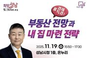 [경기뉴스원/경기뉴스1] | 성남시는 오는 11월 19일 오후 3시 50분~5시 30분 시청 1층 온누리에서 ‘부동산 전망과 내 집 마련 전략’을 주제로 한 희망성남 토크콘서트 8강을 연다. 이번 초빙 강사는 고종완 한국자산관리연구원장이다. 고종완 원장은 변화하는 부동산시장 속에서 시민들이 알아야 할 부동산 정책, 향후 시장 전망, 내 집 마련 전략 등에 관해 강연한다. 고 원장은 한양대학교 도시공학박사로 건국대학교 부동산대학원 초빙교수, 한양대학교 부동산융합대학원 특임교수, LH자문위원 등을 역임했다. 현재 국민연금공단 대체투자위원회 위원, 금융위원회 금융발전심의회 위원 등으로 활동하고 있다. 저서로 ‘살 집 팔 집’, ‘대한민국 부동산 전쟁’ 등이 있다. 강연은 무료로 진행되며, 성남시 평생학습 통합 플랫폼 ‘배움숲’ 홈페이지를 통해 선착순 600명까지 신청할 수 있다. 성남시는 경제 특강 2탄으로 오는 12월 9일 김광석 한국경제산업연구원 경제연구실장을 초빙해 희망성남 토크콘서트 올해 마지막 강연(9강)을 연다.