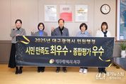 [경기뉴스원/경기뉴스1] | 대구 서구청은 대구시에서 실시한 2025년 민원행정 시민 만족도 조사에서 최우수, 종합평가에서 우수 기관에 선정됐다고 밝혔다. 대구시는 민원행정서비스 품질 향상을 위해 매년 ‘민원행정 시민 만족도 조사’를 실시하고 있다. 시민 만족도 조사는 지난해 10월부터 올해 9월까지 민원 서비스를 이용한 시민을 대상으로 민원 서비스 과정, 서비스 결과, 민원 응대 태도 및 전반적인 만족도에 대해 전화 설문의 형태로 이루어졌으며, 서구는 9개 구·군 중에서 가장 높은 종합만족도 96.8점을 얻어 ‘최우수’기관으로 선정되는 쾌거를 이루었다. 또한 서구는 대구시에서 매년 실시하고 있는 민원행정 종합평가에서도 3년 연속‘우수’기관으로 선정되는 영예를 안았다. 대구시의 민원행정 종합평가는 9개 구·군의 민원제도 운영 분야 14개 지표와 민원처리 현황 분야 8개 지표 등 총 22개 지표에 걸쳐 이루어진다. 서구는 안전한 근무환경 조성, 스마트 민원서비스 운영 지원, 고충민원 처리·관리 및 해결 노력 등 전반적인 분야에서 높은 평가를 받았다. 특히, 2일 이상 법정민원