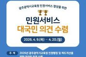 [경기뉴스원/경기뉴스1] | 광주시교육청은 민원서비스 품질 향상을 위해 오는 9~20일 국민권익위원회 온라인 정책참여 플랫폼 ‘국민생각함’과 ‘시교육청 누리집’을 통해 대국민 의견을 수렴한다. 이번 의견 수렴은 국민의 다양한 목소리를 민원행정과 제도개선에 반영해 광주교육 민원서비스 만족도를 높이기 위해 추진됐다. 의견 수렴 내용은 ▲민원서비스 향상을 위한 제도 개선 ▲민원실 편의시설 및 환경 개선 ▲기타 민원서비스 이용 시 불편사항 및 개선 아이디어 등이다. 지난해 실시한 ‘2025년 민원서비스 개선 대국민 의견수렴’에는 595명의 국민이 참여해 다양한 의견을 제시했다. 시교육청은 올해도 다양한 의견을 듣기 위해 참여자 중 20명을 추첨해 모바일 음료 교환권을 증정하는 이벤트를 진행한다. 박준수 행정국장은 “시민 눈높이에 맞는 민원서비스를 제공하기 위해서는 현장 의견을 듣고 정책에 반영하는 것이 무엇보다 중요하다”며 “수요자 중심의 민원행정과 제도개선을 통해 신뢰받는 교육행정이 실현되도록 최선을 다하겠다”고 말했다.