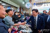 [경기뉴스원/경기뉴스1] | 이재명 대통령은 25일 오후 한국항공우주산업(KAI)에서 열린 KF-21 양산 1호기 출고식에 참석한 뒤 경남 진주시에 위치한 진주중앙시장을 깜짝 방문해 민심을 청취했다. 진주중앙시장은 1884년 개장한 유서 깊은 전통시장으로, 진주 지역의 대표 상업 거점으로 자리하고 있다. 이재명 대통령은 후보 시절이던 지난해 5월에도 이곳을 방문한 바 있다. 상인들과 주민들은 예고 없이 깜짝 등장한 이재명 대통령을 환호와 박수로 맞이했다. 현장에서는 “이재명 대통령 최고!”, “사랑합니다”, "감사합니다", “멋있어요”, “고생 많으십니다” 등 다양한 응원의 목소리가 이어졌다. 이재명 대통령은 시민들과 일일이 눈을 맞추며 인사했고, 셀카 촬영에 응했다. 특히 아이들을 지나치지 않고 몇 살인지 묻는 등 세심하게 소통하며 함께 사진을 찍었다. 이재명 대통령은 시장 곳곳을 둘러보고, 상인들에게 장사가 잘되는지 묻는 등 현장의 목소리를 청취했다. 이재명 대통령은 상추와 애호박 등을 현금과 온누리상품권으로 구입했고, 귤과 꼬치전, 호떡, 엿, 딸기 등을 즉석에서 맛본 뒤 구입했습