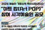 [경기뉴스원/경기뉴스1] | 경기도와 경기문화재단이 “2026 예술인 기회소득 확산사업(전시)“의 일환으로 진행하는 “아트 팝(Art POP)” 참여 시각예술인을 공개 모집한다. ‘2026 예술인 기회소득 확산사업(전시)’은 2023년부터 2025년까지 '경기도 예술인 기회소득'을 지원받은 시각예술인에게 지속적인 예술 창작 발표의 기회를 제공하고, 도민에게는 문화예술 향유 기회를 확대하기 위해 마련된 행사다. “아트 팝”의 신청 대상은 2023년부터 2025년까지 '경기도 예술인 기회소득'을 지원받은 시각예술 분야의 경기도 거주 예술인이다. 3년 동안 1회라도 지원을 받았다면 신청할 수 있고, 기존 “예술인 기회소득 페스티벌(전시)”에 참여한 이력이 있어도 신청 가능하다. 신청을 원하는 예술인은 국가문화예술지원시스템(NCAS)을 통해 지원신청서, 예술인 기회소득 지급 사실 증빙 자료 등을 제출하면 된다. 특히 이번 “아트 팝”에는 회화, 조각, 공예, 설치, 미디어, 일러스트, 웹툰, 그래피티 아트, 디지털 페인팅 등 모집 분야를 확대해 보다 다양한 시각예술 분야의 예술인들이 참여할 수 있도록 했다
