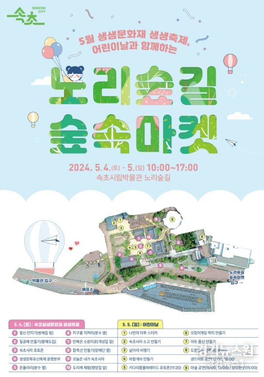경기뉴스원(경기뉴스1) | 속초시립박물관은 5월 첫 주 주말과 어린이날을 맞아‘속초문화재 생생축제’,‘어린이날 행사’와 함께하는‘노리숲길 숲속마켓’을 개최한다.