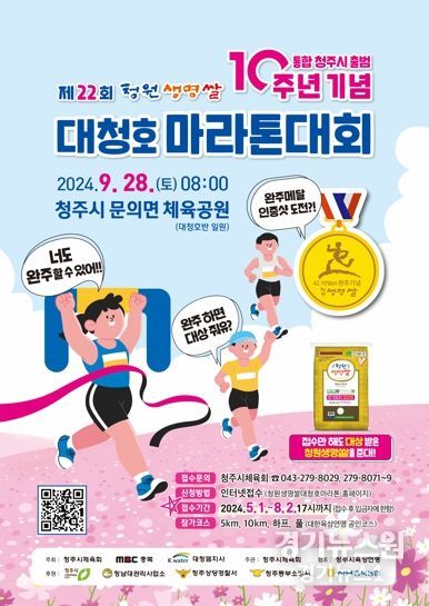 경기뉴스원(경기뉴스1) | 청주시는 오는 9월 28일 청주시 문의체육공원에서 개최되는 ‘통합청주시 출범 10주년 기념 제22회 청원생명쌀 대청호마라톤 대회’ 참가 신청을 받는다고 밝혔다.