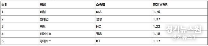 ‘쉘힐릭스플레이어’는 WAR(대체 선수 대비 승리 기여도)을 기반으로 선정하며, 3~4월 투수 부문에서는 KIA 네일이 WAR 1.70으로 1위를 차지했다. 네일은 평균자책점 1위(1.47), 다승 1위(4승), WHIP(이닝 당 출루 허용률) 2위(0.98)에 볼넷은 단 3개만 내주는 등 4월 중순부터 랭킹 상위권에 모습을 드러낸 이후 1위 자리를 줄곧 지켜왔다.