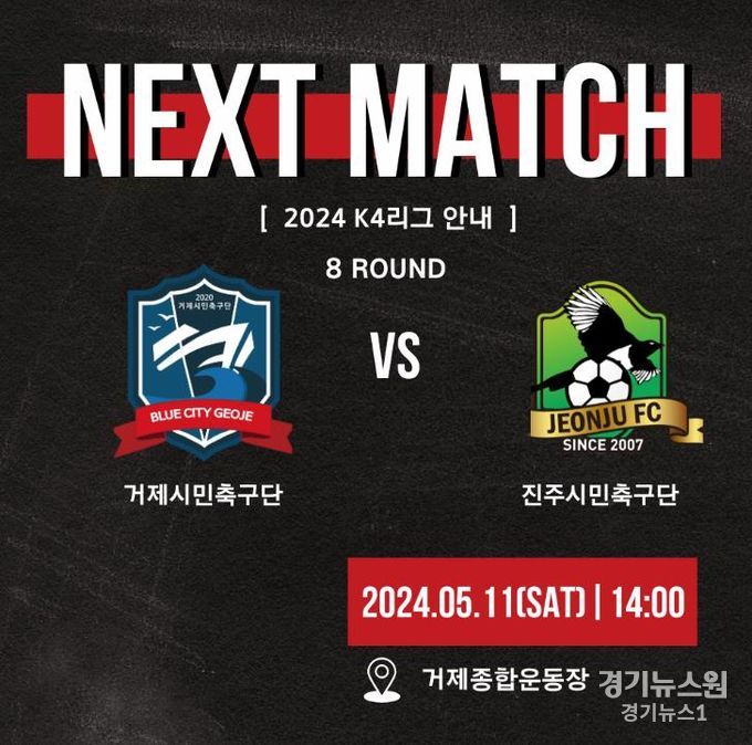 경기뉴스원(경기뉴스1) | 2024시즌 K4리그 8라운드 거제시민축구단과 진주시민축구단과의 홈 경기가 2024년 5월 11일 토요일 14시에 거제종합운동장에서 개최될 예정이다.