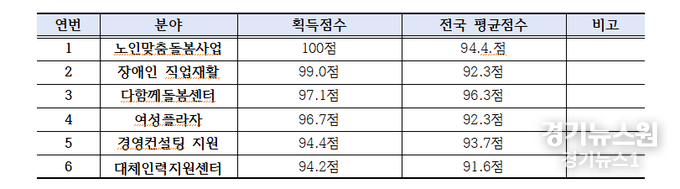 점수를 살펴보면 ▲노인맞춤돌봄사업 100점(전국평균 94.4점) ▲장애인직업재할 99점(92.3점) ▲다함께돌봄센터 97.1점(96.3점) ▲여성플라자 96.7점(92.3점) ▲경영컨설팅지원 94.4점(93.7점) ▲대체인력지원센터 94.2점(91.6점)이다.
