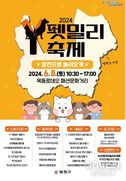경기뉴스원(경기뉴스1) | 양천구는 6월 8일 목동로데오 패션거리 일대에서 역대 최대 규모 반려동물 체험형 문화행사인 ‘2024 Y펫밀리 축제’를 개최한다고 밝혔다.