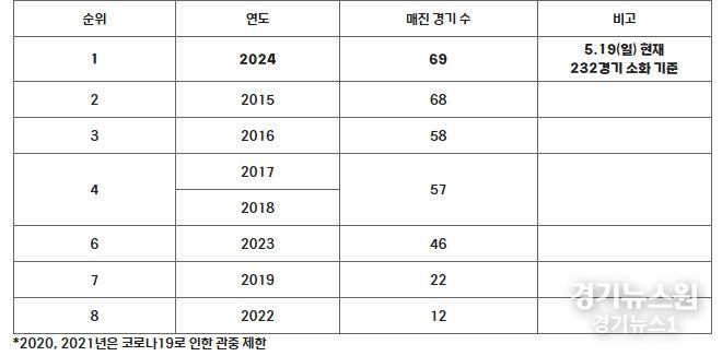 지난 3월 23일(토) 개막전 전 경기가 매진되며 화려한 막을 올린 KBO리그는 지난 19일(일)까지 열린 232경기에서 총 69경기가 매진됐다. 이는 2015 시즌에 기록된 68경기를 넘어서, 리그가 10개 구단 체재로 운영된 2015 시즌 이후 최다 매진 기록이다.