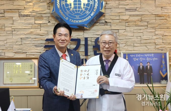 이어 이동섭 국기원장이 김창준 前 미국 연방하원의원 등 6명에게 명예 7단증을 수여하고 태권도복과 띠를 증정했다.